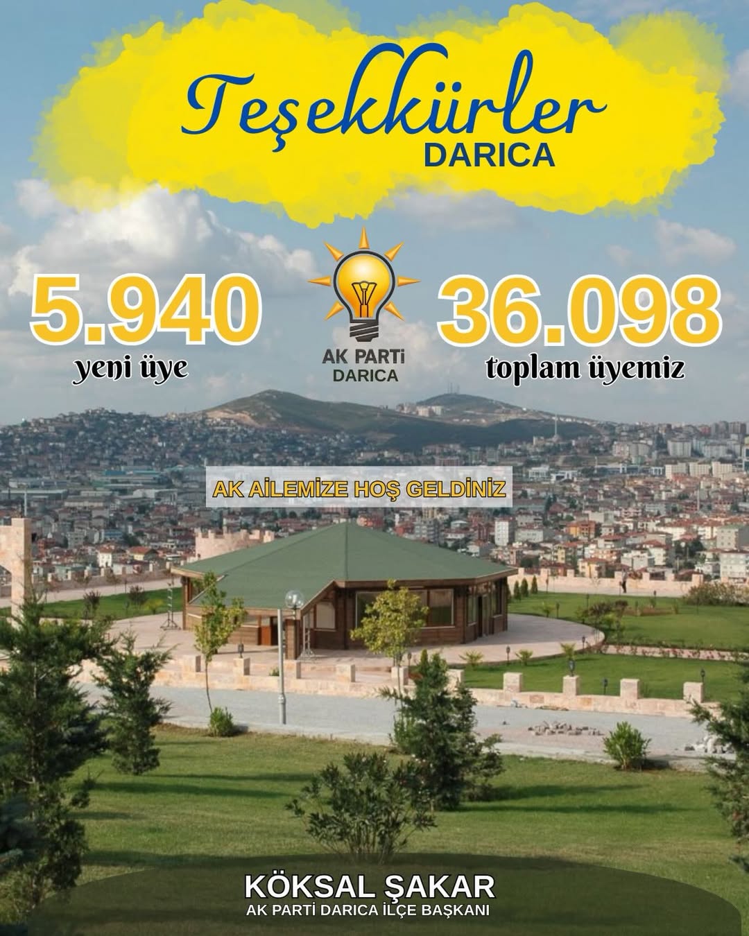 AK Parti Darıca İlçe Başkanı Köksal Şakar, Cumhurbaşkanı ve AK Parti Genel Başkanı Recep Tayyip Erdoğan’ın liderliğinde Darıca’da üye sayısında rekor seviyeye ulaşıldığını duyurdu. Şakar, milletle kurulan gönül bağının, güvenin ve istikrarın en somut göstergesinin üye sayısındaki artış olduğunu belirtti. Darıca’da 5 bin 940 yeni üyenin partiye katıldığını ifade eden Şakar, bu artışla birlikte AK Parti Darıca teşkilatının 36 bin 98 kişilik büyük bir aileye dönüştüğünü vurguladı.