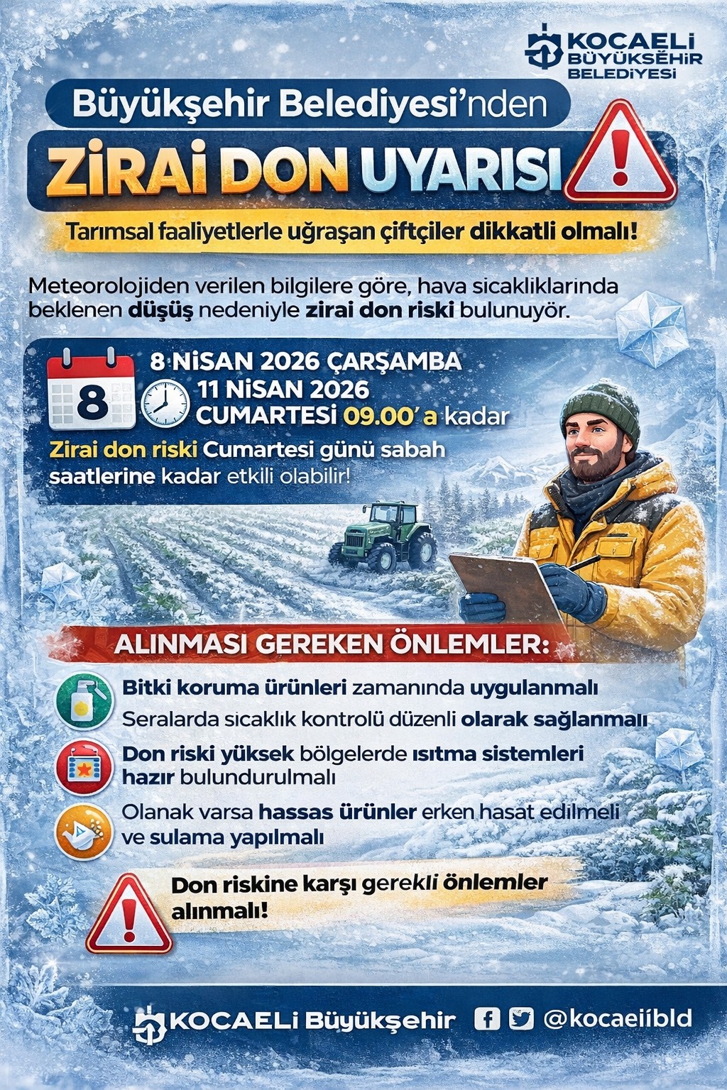 Açıklamada, söz konusu riskin 8 Nisan Çarşamba (yarın) günü saat 00.00 itibarıyla başlayacağı ve 11 Nisan Cumartesi günü saat 09.00’a kadar etkili olmasının beklendiği ifade edildi. Kocaeli Büyükşehir Belediyesi ayrıca, il genelindeki çiftçilere zirai don riskine karşı bilgilendirme amacıyla SMS gönderdi.