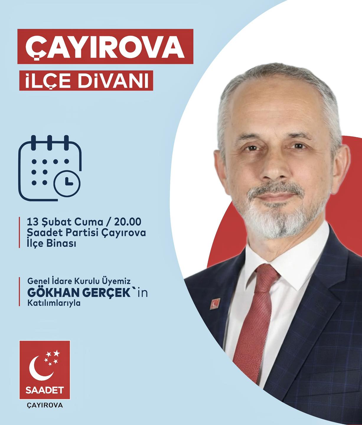 Saadet Partisi Çayırova İlçe Teşkilatı, 13 Şubat Cuma akşamı geniş kapsamlı bir divan toplantısı gerçekleştirecek. Genel İdare Kurulu (GİK) Üyesi Gökhan Gerçek’in de hazır bulunacağı toplantıda, Çayırova yerelindeki siyasi stratejiler ve teşkilat çalışmaları masaya yatırılacak. Saadet Partisi Çayırova İlçe Başkanlığı, “Büyük Buluşma” olarak nitelendirdiği haftalık ve aylık performansın değerlendirildiği İlçe Divan Toplantısı’na hazırlanıyor. İlçe Başkanı Sinan Aydemir’in ev sahipliğinde gerçekleşecek olan toplantı, Milli Görüş camiasını bir araya getirecek. 13 Şubat Cuma günü saat 20.00’de ilçe başkanlığı binasında yapılacak toplantıda, mahalle bazlı saha çalışmaları ve üye kayıt seferberliği ele alınacak. Programın en önemli konuğu olan Saadet Partisi GİK Üyesi Gökhan Gerçek, genel merkezin perspektifini ve Türkiye gündemine dair Milli Görüş çözümlerini partililere aktaracak. Başkan Sinan Aydemir, bu buluşmanın sadece bir toplantı değil, aynı zamanda bir motivasyon ve strateji zirvesi olduğunu vurguladı.