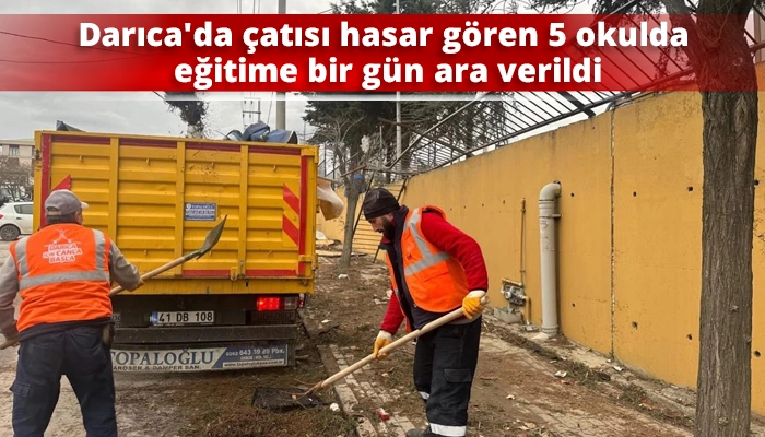 Darıca’da etkili olan fırtına nedeniyle çatısı hasar gören 5 okulda eğitime bir gün ara verildi. Edinilen bilgilere göre, fırtına sonrası İlçe Milli Eğitim Müdürlüğü ve ilgili birimler tarafından okullarda hasar tespit çalışmaları yapıldı. Çatı bölümlerinde zarar oluştuğu tespit edilen okullarda, öğrenci ve personelin can güvenliği göz önünde bulundurularak tatil kararı alındı. 9 Ocak Cuma günü eğitim-öğretime ara verilen okullar şu şekilde açıklandı: "Fevzi Çakmak Anadolu Lisesi, Aslan Çimento Mesleki ve Teknik Anadolu Lisesi, Tevfik İleri İmam Hatip Ortaokulu, Tacirler Özel Eğitim Uygulama Okulu, Mehmet Akif Ortaokulu." Eğitim-öğretimin, yapılacak çalışmaların ardından güvenli hale gelmesiyle yeniden başlayacağı bildirildi.