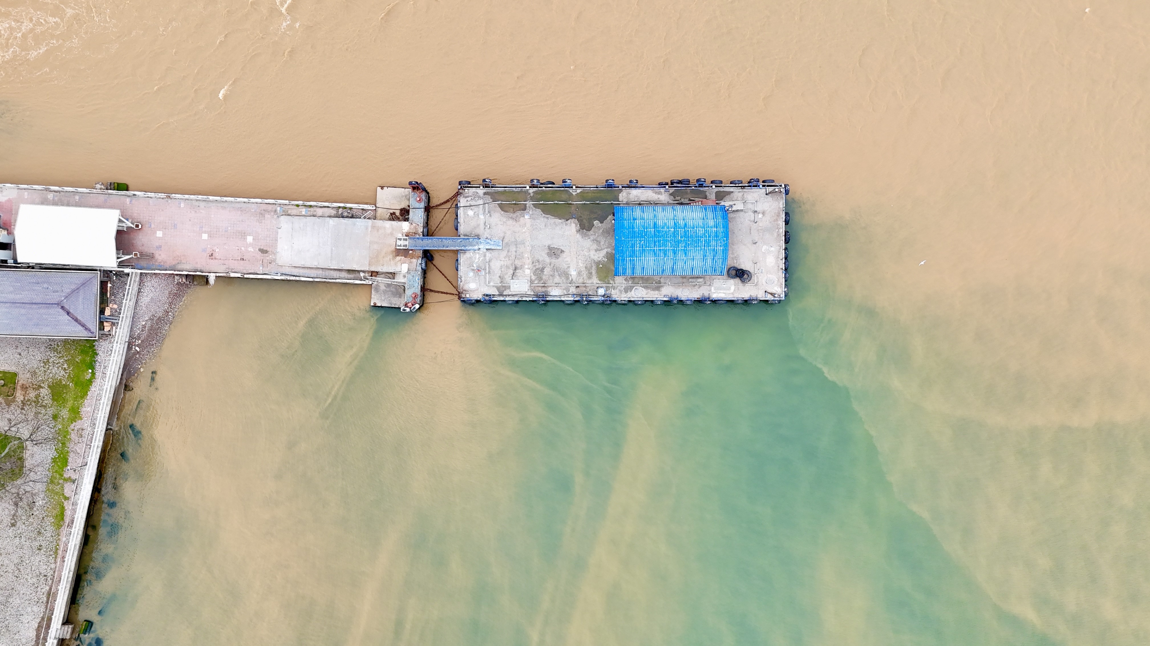 Kocaeli’nin Körfez ilçesinde etkili olan sağanağın ardından derelerden İzmit Körfezi’ne akan çamurlu sular, denizin bir bölümünün rengini kahverengiye dönüştürdü. O anlar havadan da görüntülendi.
