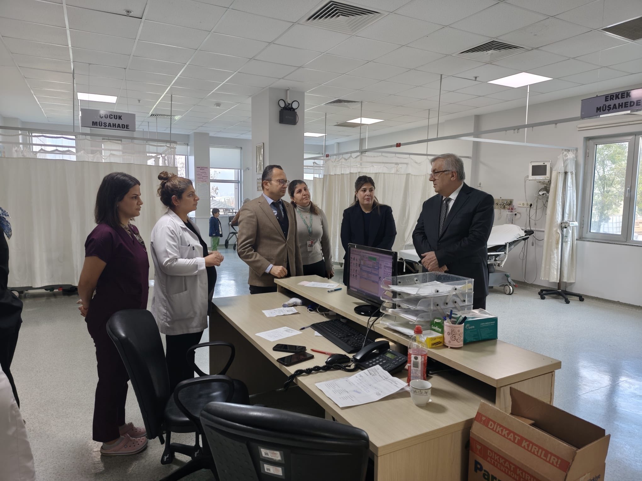 Ardından Dilovası Devlet Hastanesi ziyaret edilerek acil servis, poliklinikler, servisler, laboratuvar ve görüntüleme birimlerinde sunulan sağlık hizmetleri yerinde incelendi. İl Sağlık Müdürü Op. Dr. Yüksel Pehlevan, çalışan personel ve hekimlerle görüşerek istişarelerde bulundu, kolaylıklar diledi; vatandaşlara da geçmiş olsun temennilerini iletti. Hastane Başhekimi Op. Dr. Ömer Naci Yılmaz, hastanenin işleyişi ve yürütülen hizmetler hakkında heyete bilgilendirmede bulundu.