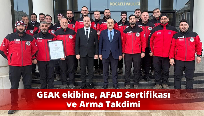 Kocaeli Valisi İlhami Aktaş'ın uhdesinde, Kocaeli Büyükşehir Belediye Başkanı Tahir Büyükakın'ın katılımlarıyla valilikte düzenlenen törene Gebze Belediye Başkanı Zinnur Büyükgöz ile birlikte katılan GEAK ekibine AFAD Akreditasyon Sertifikası ve armaları takdim edildi