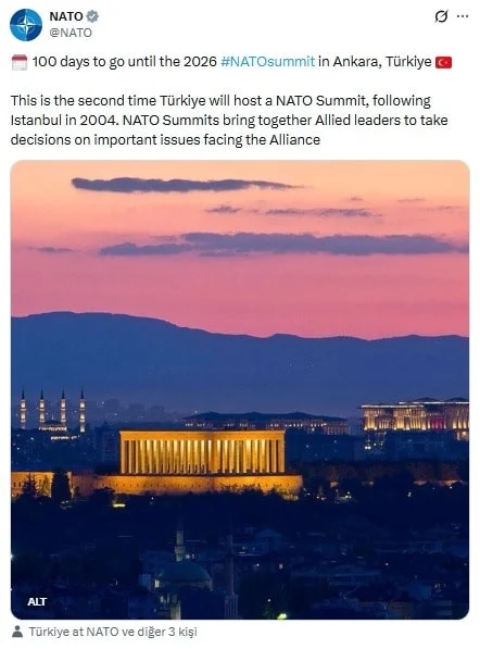 NATO, 2026 yılında Ankara’da gerçekleştirilecek zirve öncesinde sosyal medya üzerinden dikkat çeken bir paylaşımda bulundu. Paylaşımda, Mustafa Kemal Atatürk’ün ebedi istirahatgahı olan Anıtkabir’in fotoğrafına yer verildi. NATO tarafından yapılan açıklamada, “Türkiye’nin başkenti Ankara’da düzenlenecek 2026 NATO Zirvesi’ne 100 gün kaldı” ifadeleri kullanıldı. Paylaşımda ayrıca, zirvenin Türkiye’de ikinci kez gerçekleştirileceğine dikkat çekildi. İlk NATO zirvesinin Türkiye’de 2004 yılında İstanbul’da yapıldığı hatırlatılırken, bu toplantıların müttefik ülkelerin liderlerini bir araya getirerek ittifakın karşı karşıya olduğu kritik konularda karar alma sürecine katkı sağladığı vurgulandı.