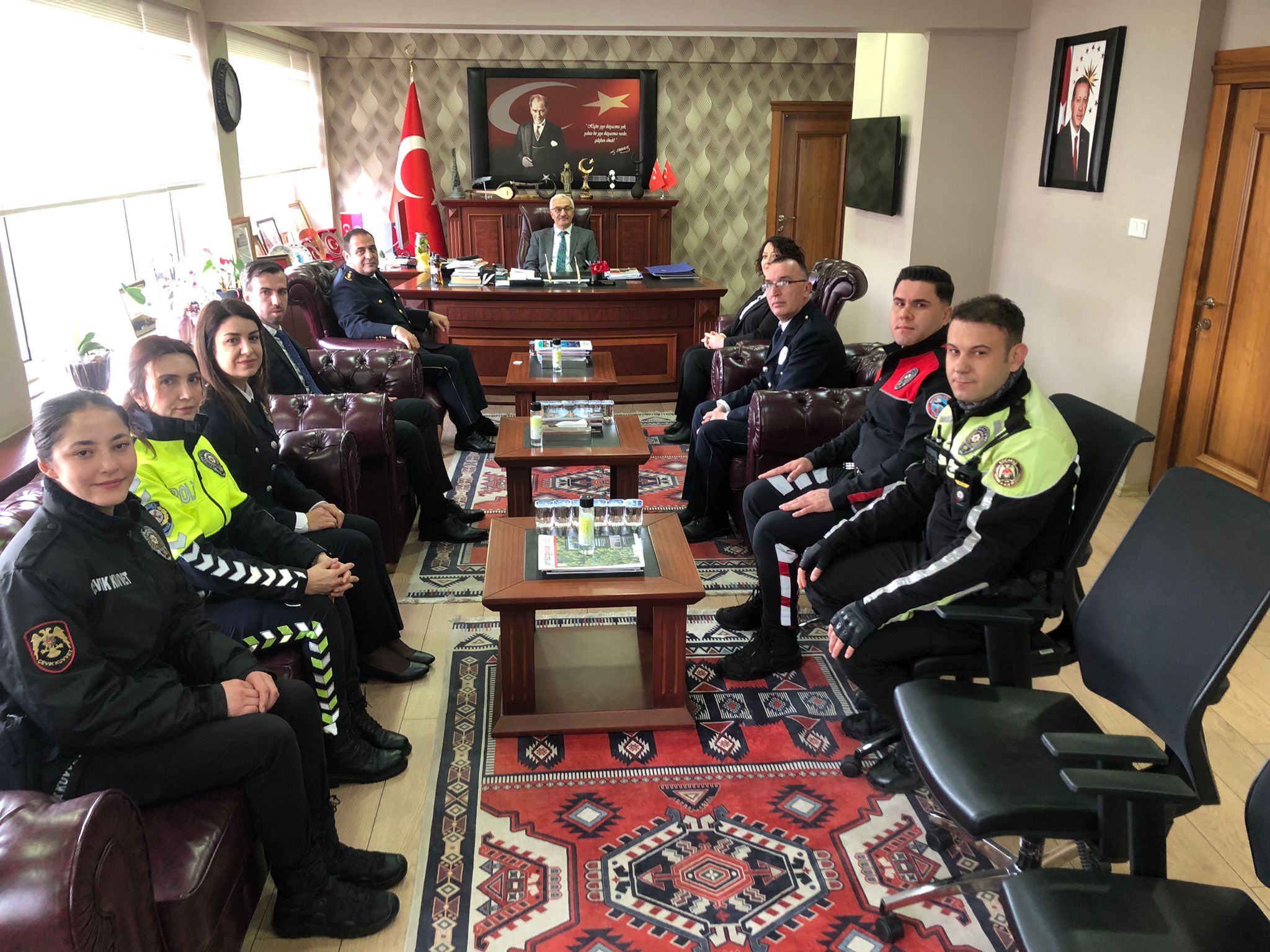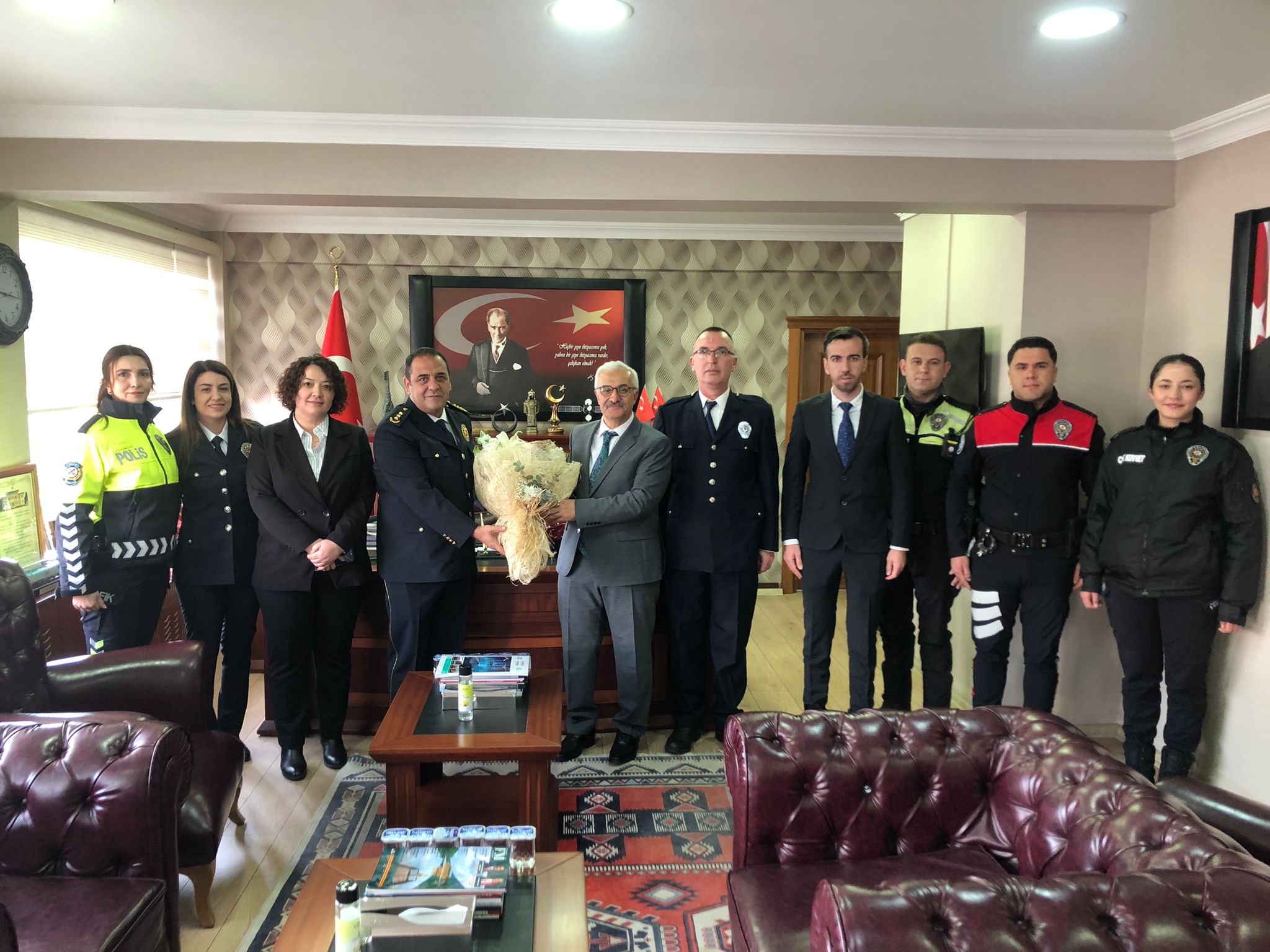 Türk Polis Teşkilatı’nın kuruluşunun 181. yılı ve 10 Nisan Polis Haftası, Gebze’de düzenlenen çeşitli etkinliklerle kutlanmaya devam ediyor. Bu kapsamda Gebze İlçe Emniyet Müdürü Adil Uğur Bilgili, emniyet mensuplarından oluşan bir heyetle birlikte Gebze Kaymakamı Mehmet Ali Özyiğit’e nezaket ziyaretinde bulundu. Ziyaret sırasında İlçe Emniyet Müdürü Bilgili, Gebze genelinde yürütülen asayiş çalışmaları, teknolojik altyapı yatırımları ve toplum destekli polislik faaliyetleri hakkında Kaymakam Özyiğit’e kapsamlı bilgiler sundu. Teşkilatın 24 saat esasına göre görev başında olduğunu hatırlatan Bilgili, Gebze halkının can ve mal güvenliğini korumak adına kararlılıkla çalışmaya devam edeceklerini ifade ederek kabullerinden dolayı teşekkür etti. Ziyaretten duyduğu memnuniyeti dile getiren Gebze Kaymakamı Mehmet Ali Özyiğit ise emniyet teşkilatının devletin bekası ve toplumun huzuru için hayati bir görev üstlendiğini vurguladı. Türk polisinin sadece suçla mücadelede değil, sosyal sorumluluk projelerinde de halkın en büyük destekçisi olduğunu belirten Kaymakam Özyiğit, tüm emniyet personelinin Polis Haftası’nı kutladı. Görevi başında olan polislere başarılar dileyen Özyiğit, vatan uğruna canlarını feda eden aziz şehitleri rahmetle yad ederken, kahraman gazilere de şükranlarını sundu. Ziyaret, günün anısına çekilen hatıra fotoğrafıyla sona erdi.
