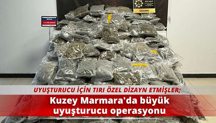 Kocaeli Emniyet Müdürlüğü Narkotik Suçlarla Mücadele Şube Müdürlüğü ekipleri, tır ile yüklü miktarda uyuşturucu taşınacağının tespiti üzerine operasyona start verdi. Kuzey Marmara Otoyolu üzerinde uyuşturucu taşıyan tır durduruldu. Narkotik köpeği Talisca ile birlikte yapılan aramada tırın dorsesinin taban kısmına zulalanmış vaziyette 218 paket halinde, 116 kilo skunk maddesi ele geçirildi. Malzemelere el koyulurken araç sürücüsü C.A. gözaltına alındı. İfadesi sonrasında adliyeye sevk edilen şüpheli, tutuklanarak cezaevine gönderildi.