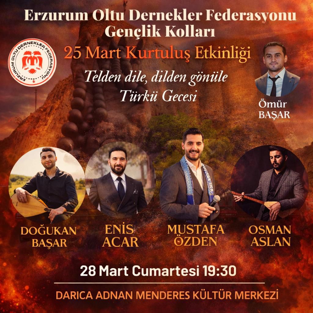 Kocaeli’de yaşayan Erzurumlular ve Oltulular, memleketlerinin gurur gününü anlamlı bir etkinlikle kutlamaya hazırlanıyor. Oltu Dernekler Federasyonu Gençlik Kolları tarafından organize edilen etkinlik, Oltu’nun kurtuluşunun manevi ruhunu türküler eşliğinde gönüllere taşıyacak. 25 Mart Oltu’nun Kurtuluşu etkinlikleri kapsamında planlanan program, 28 Mart Cumartesi günü saat 19:30’da başlayacak. Darıca Adnan Menderes Kültür Merkezi’nin ev sahipliği yapacağı gecede, yöresel sanatçılar ve halk müziği toplulukları sahne alacak. Erzurum ve Oltu yöresine ait en sevilen eserlerin seslendirileceği etkinlikte, gurbetteki hemşehrilerin memleket özlemi giderilecek.
