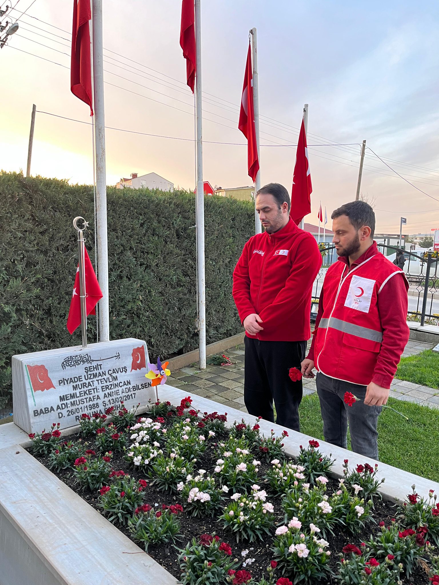 Türk Kızılay Darıca Şube Başkanı Ozan Budak ve beraberindeki heyet, Darıcalı Şehit Murat Tevlim’i şehadet yıl dönümü vesilesiyle kabri başında ziyaret etti. Ziyarette şehidimizin ruhuna dualar okunurken, vatan savunmasında gösterilen fedakarlık vurgulandı.
