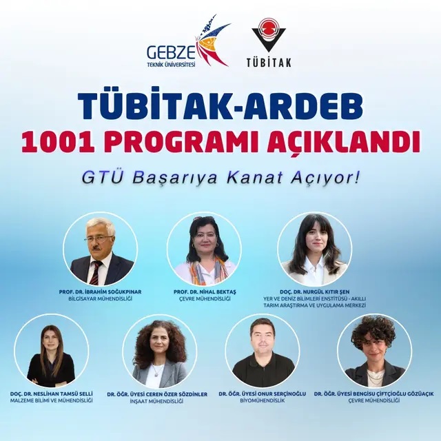 TÜBİTAK (Türkiye Bilimsel ve Teknolojik Araştırma Kurumu) tarafından çağrı açılan ‘1001-Bilimsel ve Teknolojik Araştırma Projelerini Destekleme Programı’ kapsamında 2025 yılı 2. döneminde Araştırma Destek Programları Başkanlığı’na (ARDEB) önerilen projelerin bilimsel değerlendirme süreci tamamlanarak sonuçlar açıklandı. Gebze Teknik Üniversitesi’nden (GTÜ) 7 akademisyenin projeleri destek almaya hak kazandı. 1001- Bilimsel ve Teknolojik Araştırma Projelerini Destekleme Programı kapsamında bilimsel olarak destek alan akademisyenler ve araştırma projeleri şöyle: