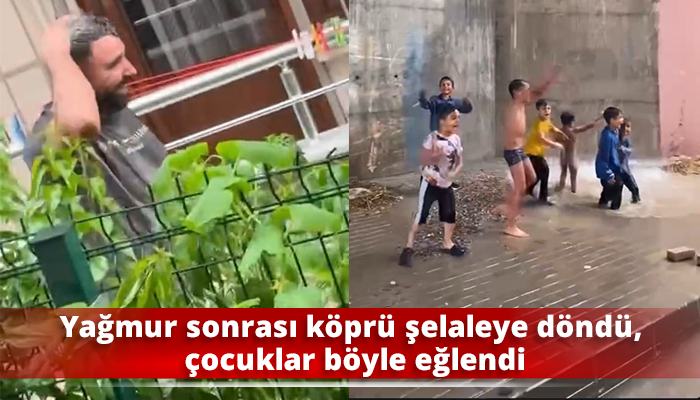 Yağmur sonrası köprü şelaleye döndü, çocuklar böyle eğlendi