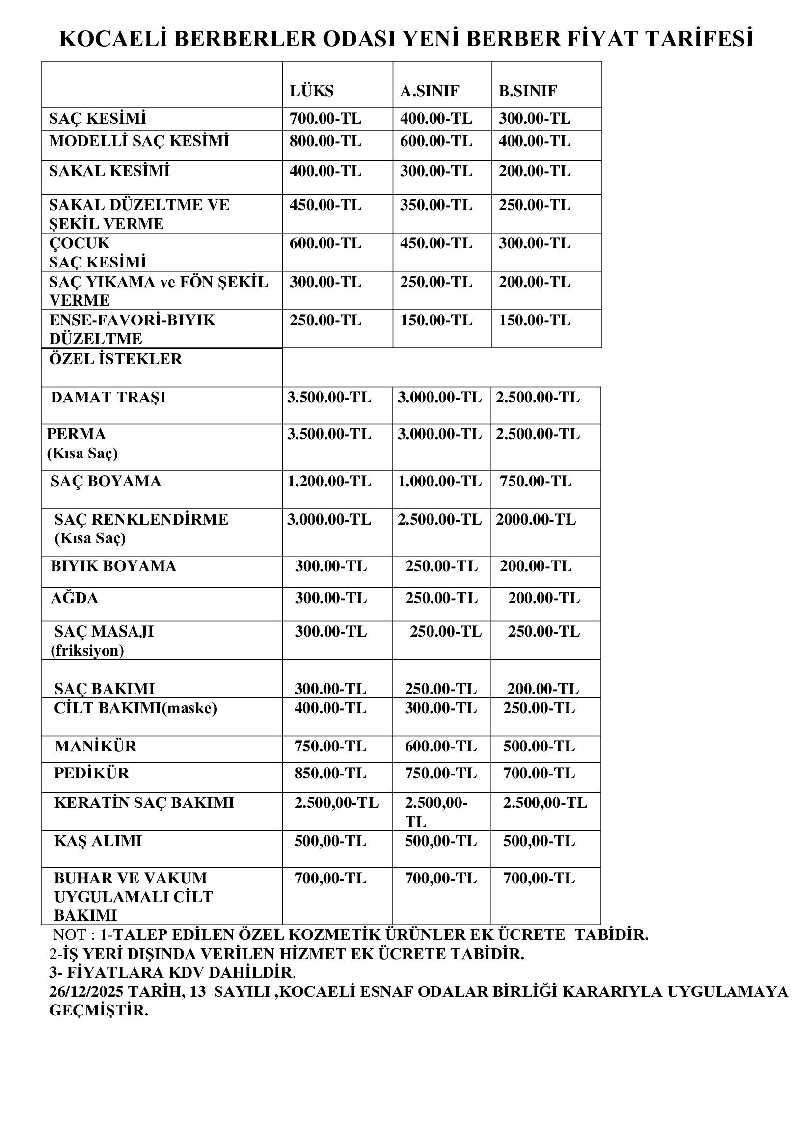 Kocaeli Berberler Odası tarafından belirlenen yeni berber fiyat tarifesi yürürlüğe girdi. Kocaeli Esnaf Odaları Birliği’nin kararıyla onaylanan tarife; lüks, A sınıfı ve B sınıfı işletmeler için ayrı ayrı belirlendi. Fiyatlara KDV dahil edilirken, talep edilen özel kozmetik ürünler ile iş yeri dışında verilen hizmetlerin ek ücrete tabi olacağı bildirildi. Kocaeli Berberler Esnaf ve Sanatkarlar Odası Başkanı Mustafa Bozkurt, il genelindeki tüm ilçelerde yeni tarifelerin Ocak 2026 itibarıyla eş zamanlı olarak yürürlüğe gireceğini duyurarak tarifeleri açıkladı. Berberlere sürekli zam geliyor konusuna dikkati çeken Kocaeli Berberler Esnaf ve Sanatkarlar Odası Başkanı Mustafa Bozkurt, "Öz eleştiri yapmamız gerekirse Kocaeli'de berberlere 3 ayda bir zam geliyor algısının, biraz da odalar olarak bizler arasındaki iletişimsizlikten kaynaklandığı kanısına vardık. Zira ilimizde 4 meslek odamız ve diğer ilçelerimizde bünyesinde berber kuaför bulunduran 6 karma odamız var. Bu odalarımız birbirinden ayrı, farklı zamanlarda tarife çıkardığında; basınımıza ‘Berberlere zam geldi’ başlığıyla haber olunca, aslında haberin içeriğinde basınımız hangi ilçede olduğunu belirtmiş olmasına rağmen, sadece başlık üzerinden değerlendirme yapılıp haberin içeriği okunmadığı için belli bir kesim tarafından acımasızca eleştiri ve yorumlar yapılmaktaydı " diye konuştu.