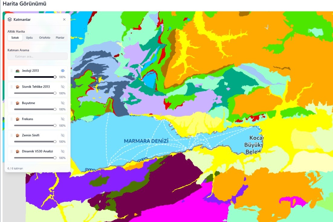 Afetlere karşı hazırlık çalışmalarını kararlılıkla sürdüren Kocaeli Büyükşehir Belediyesi, projeyi İmar ve Şehircilik Dairesi Başkanlığı’na bağlı Zemin Deprem İnceleme Şube Müdürlüğü aracılığıyla yürütüyor. Belediyelere ait zemin etüt raporlarının yanı sıra Maden Tetkik ve Arama Genel Müdürlüğü (MTA) başta olmak üzere ilgili kurumlardan temin edilen veriler dijital ortama aktarılıyor. Sıvılaşma potansiyeli, heyelan riski ve fay hatlarına ilişkin kritik haritalar da sistemde yer alıyor.